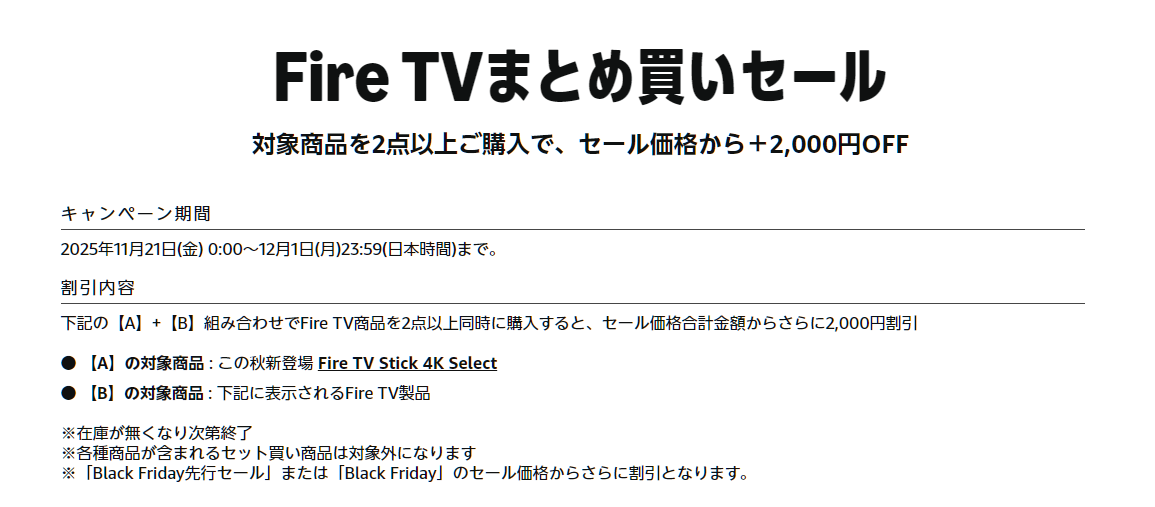Fire TVまとめ買いセールを行っており、対象商品を2点以上ご購入で、セール価格から+2,000円OFFとなっています。
