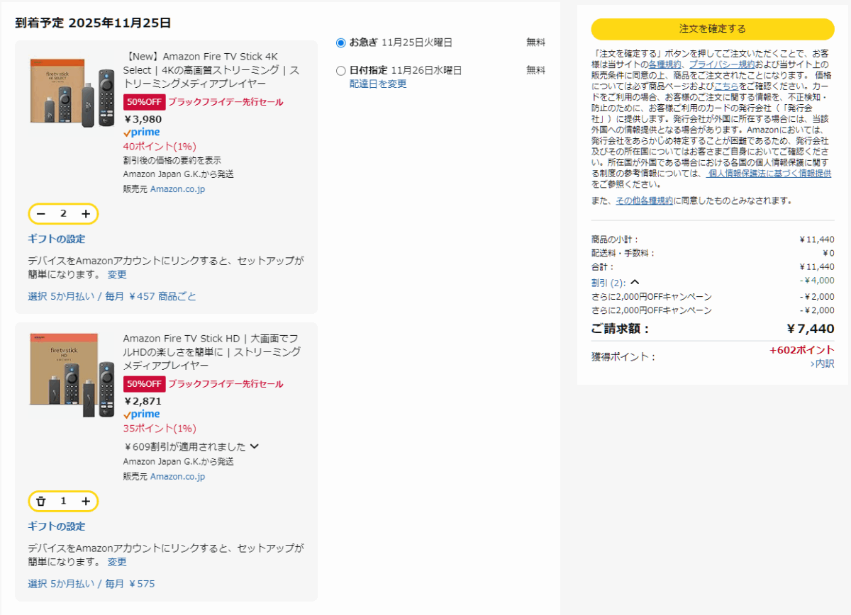 またバグなのか、Fire TV Stick 4K Selectが2個、Amazon Fire TV Stick HDを1個同時購入すると4000円オフになります…。すごい安い…。