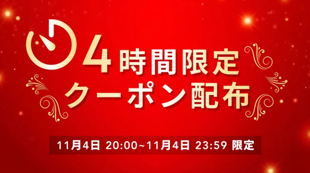 | 楽天DEALで4時間限定、対象商品+10%(1000ptまで) | 11月4日20:00~23:59 |