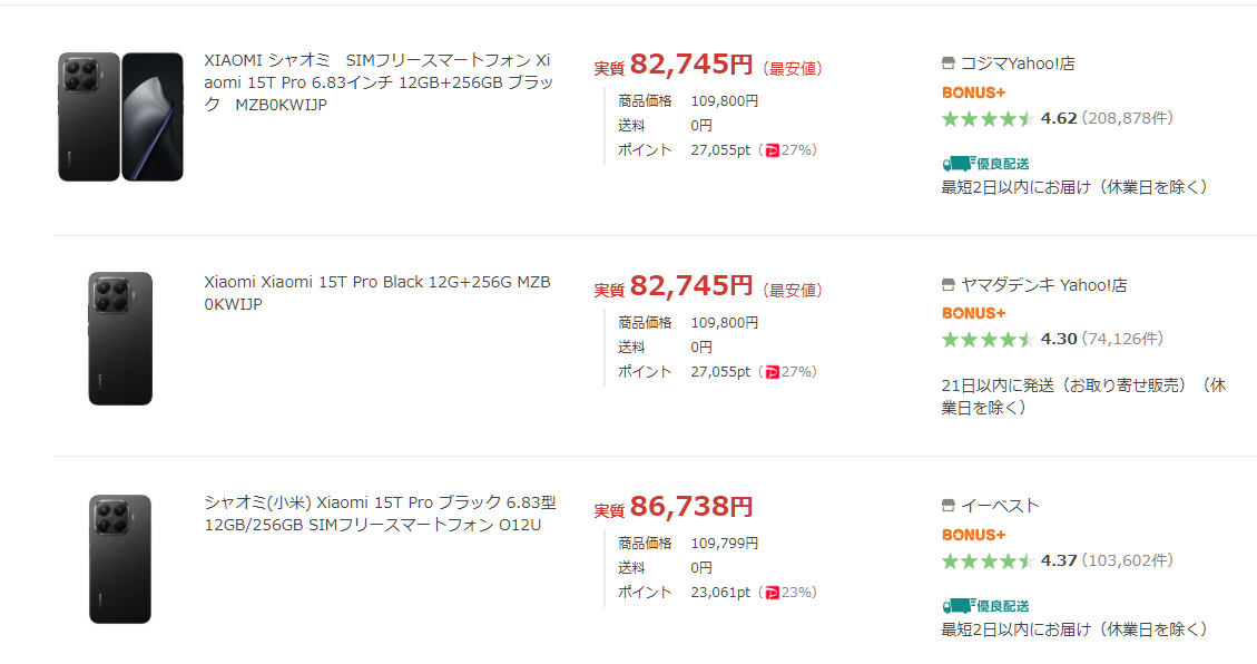 Xiaomi 15T Pro 12GB+256GB版は10万9800円にポイント還元が2万7055pt(27%還元)で実質8万2745円が最安値になっています。かなり安いですね。