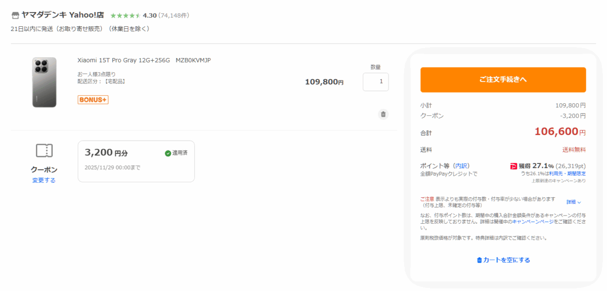 ※ Yahoo!ショッピングは週末などにポイント還元率がアップします。その時のものです。