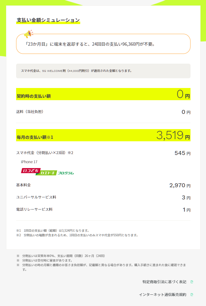 個人的にはahamo回線が不要でiPhone17を2年レンタルしたいという方は6ヶ月ほどahamoを利用しての解約(※1)がよいでしょう。その場合は回線費用が2,974円 x 6ヶ月分 = 17,844円 + iPhone17 2年レンタル費用6,468円 = 24,312円となります。