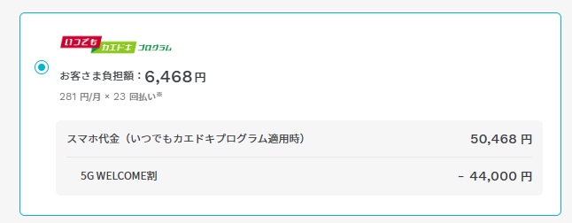 詳しく解説すると、iPhone17はドコモでは108,900円で販売されていますが、いつでもカエドキプログラム(2年レンタル)では56,540円→2025年12月25日から50,468円となっています。