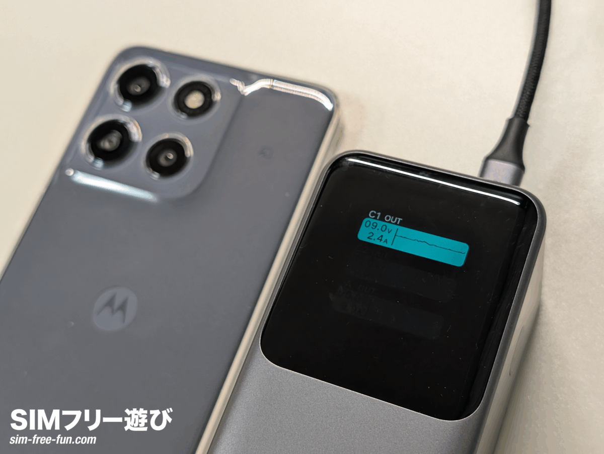 筆者が調べた限りでは9.0V x 2.4A=21.6W前後で充電できていたので、市販のものでも十分と言えると思う。モトローラは上位レンジのスマホでは120W充電等に対応しているが、moto g66j 5Gはミドルレンジ。ミドルレンジで33Wであれば十分といえるだろう。