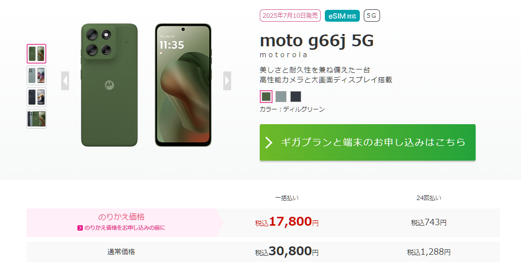 モトローラ moto g66j 5Gは実質21,378円~となっており、過去最安値です。