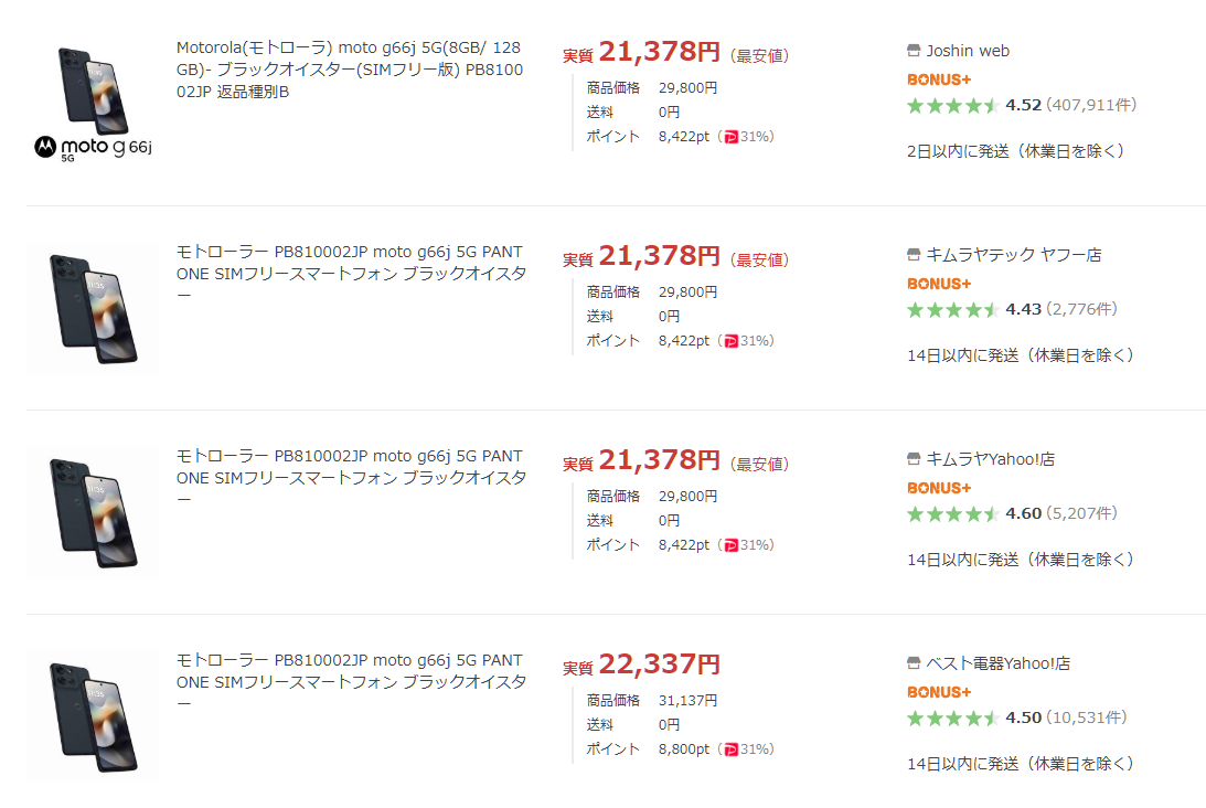 moto g66j 5Gの定価は34,800円ですが、2万5000円前後で販売されているところが多い印象です。特にセール時にはこれぐらいの価格になり、この価格ならかなり「買い」と言えるでしょう。