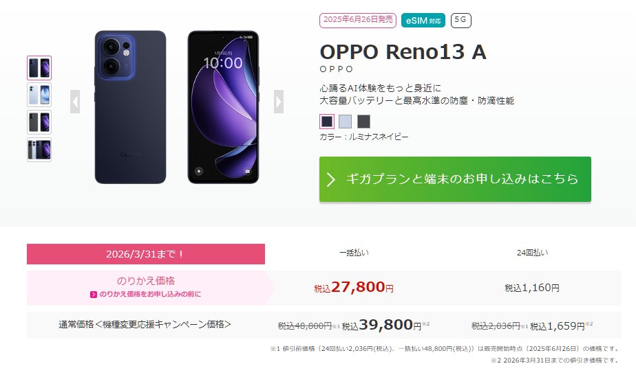 IIJmioにMNPで乗り換え+OPPO Reno13 Aを同時購入すると端末代金が27,800円となるセールを実施中です。セール期間は3月31日まで。