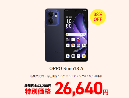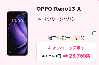 OPPO Reno13 Aの最安値は実質33,409円で、過去最安値を更新しています。