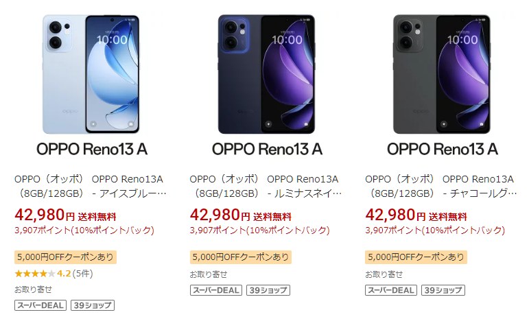 ジョーシン 楽天市場店では、OPPO Reno13 Aが42,980円にスーパーDEALの対象でポイント10倍バック、5,000円オフクーポンを配布しています。