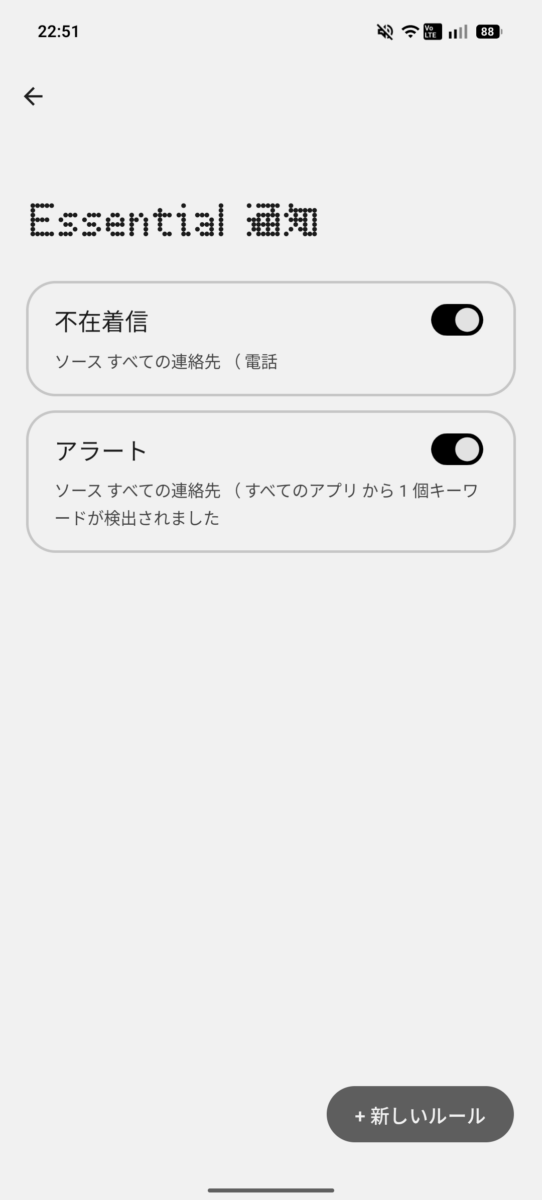 通知が来ると通知LEDが2回点滅します。その後は全く光ったりしませんが、【Essential 通知】の項目でルールを制作し、そのルールをONにしておくことで見逃した後も点灯したままにすることができます。