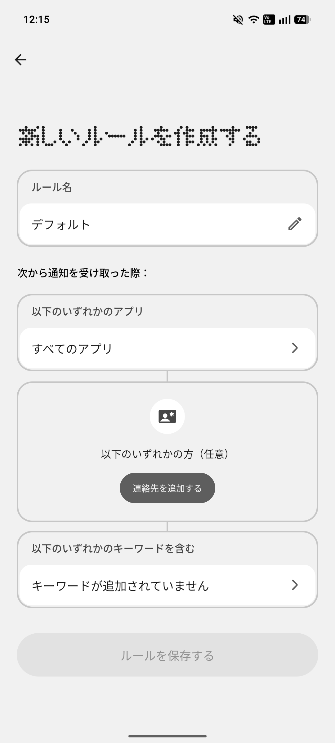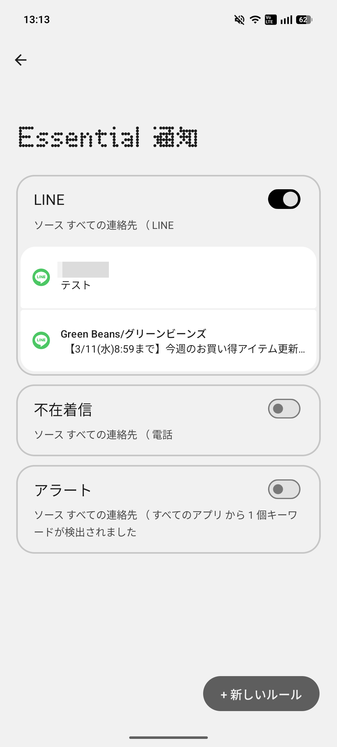 【Essential 通知】設定画面では「不在着信」「アラート」というものがルールとしてデフォルトで作られていました。新しいルールを選択し、新しくルールを作ります。