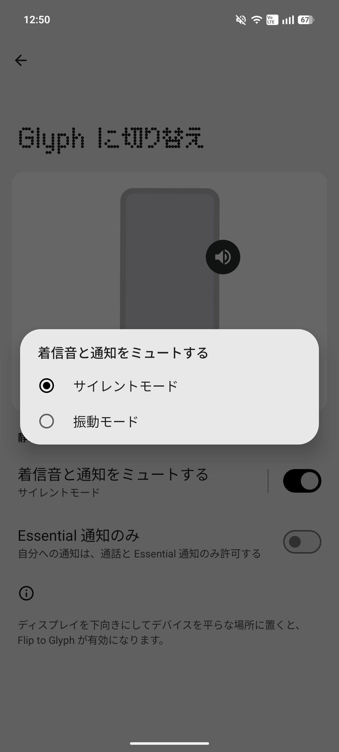 【Glyphに切り替え】では、ディスプレイを下向きにしてPhone (3a) Liteを平らなところ(机など)に置くと、背面のLEDが点滅して通知を教えてくれるようにする機能です。
