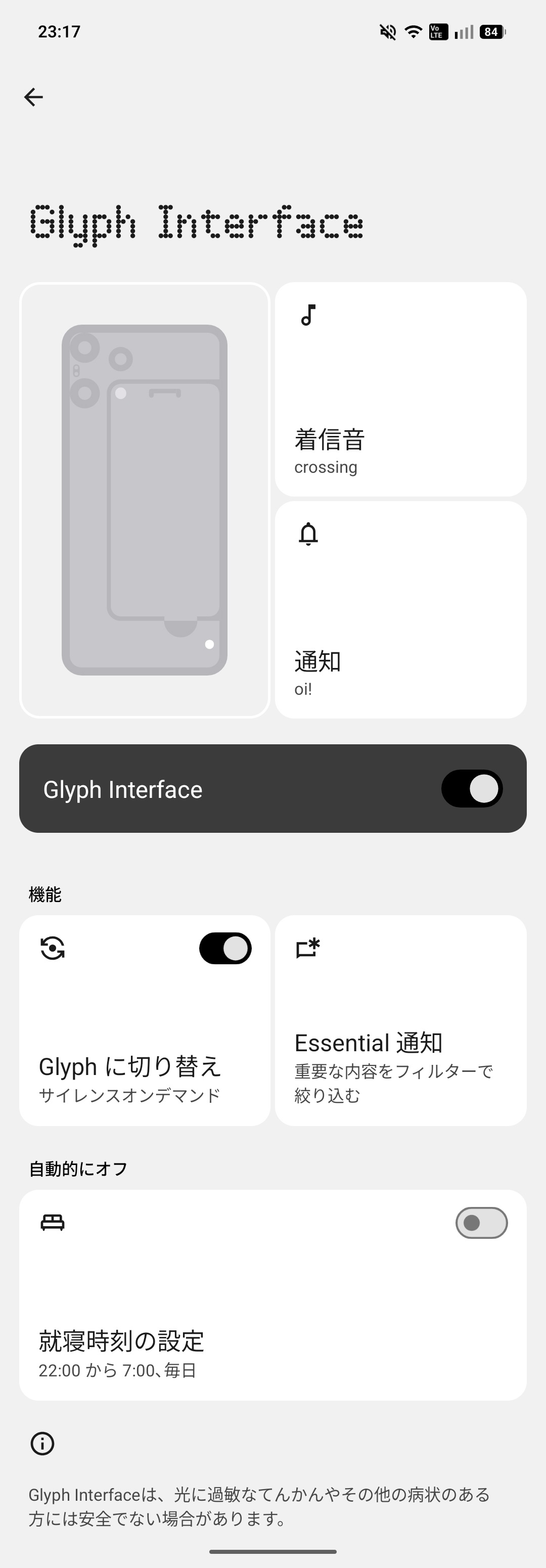 Nothingではこの独自のLEDで光る部分をGlyphライトと呼んでおり、このGlyph ライトの設定を行う「Glyph Interface」という設定項目があります。こちらでGlyphライトをどのように使うか設定できる機能を提供しています。