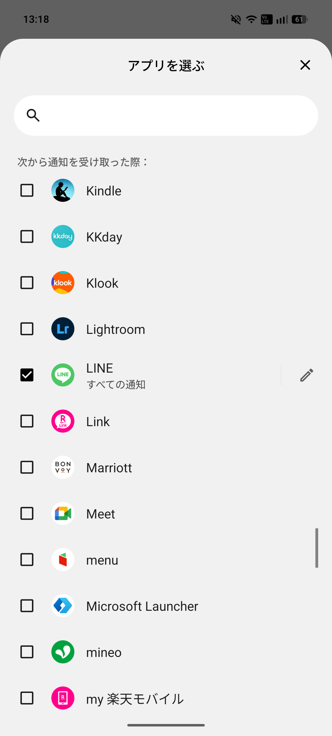 「次から通知を受け取った際:」の「すべてのアプリ」部分をタップし、今回は「LINE」のチェックボックスにチェックを入れておきます。