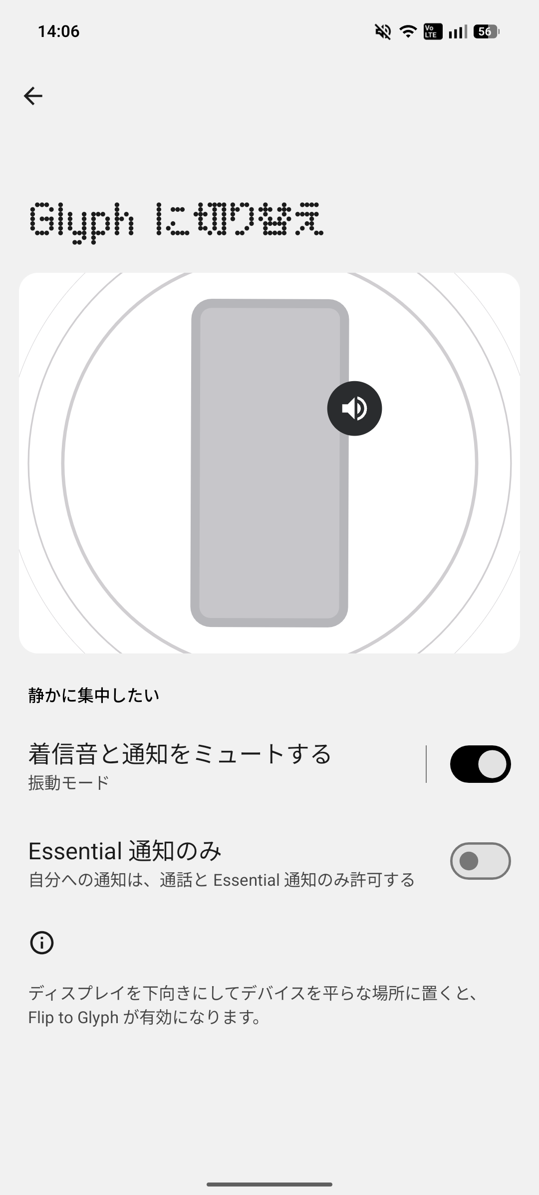 「Essential 通知のみ」というのは、Essential 通知でルール作成した項目でONになっているものだけを通知するかどうかを決めることが出来ます。こちらをONにすると、Essential 通知でルールをONにしていない通知が来た場合、Glyphライトは点灯しません。