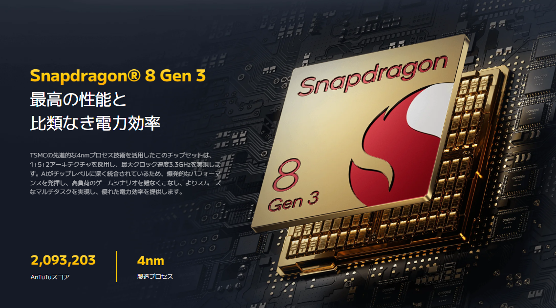 SoCはQualcommの「Snapdragon 8 Gen 3」を採用。準ハイエンド~ハイエンドの性能