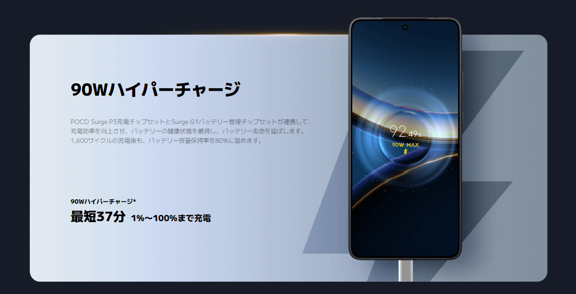 充電は最大90Wの急速充電に対応しており、専用の充電器も付属しています。