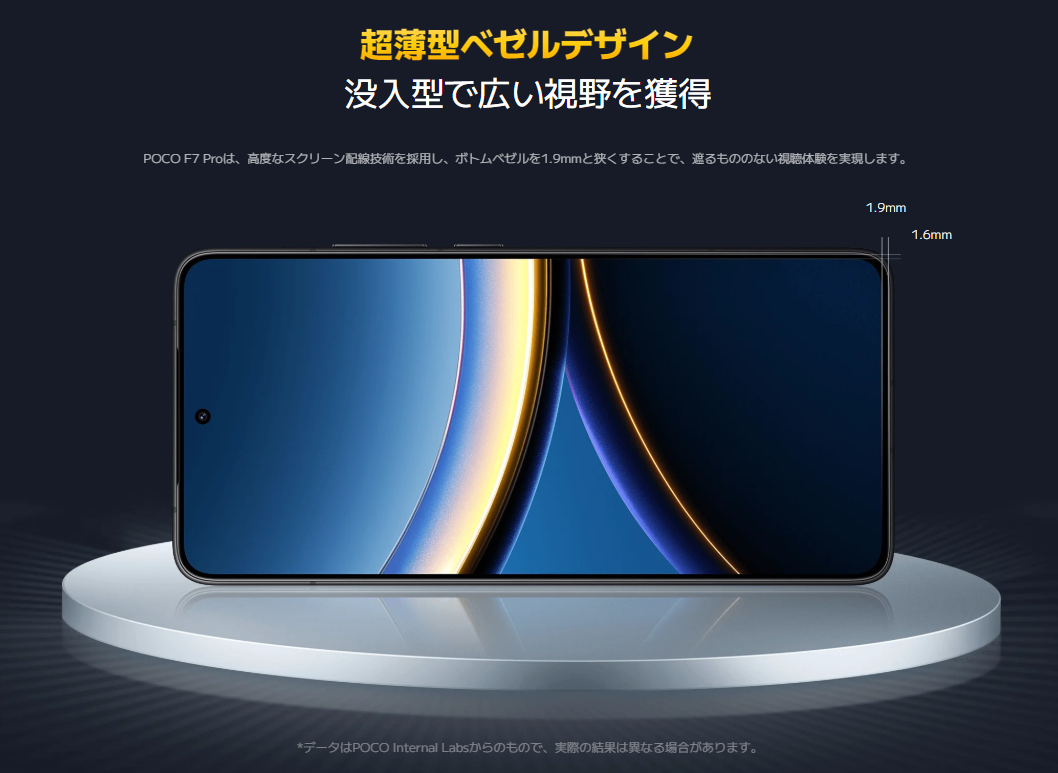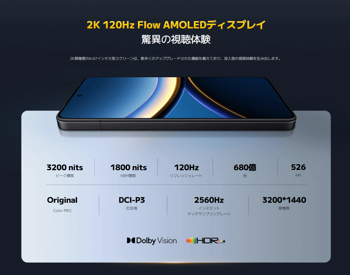 POCO F7 Proは6.67インチで2kの解像度。最大輝度は3200nitと晴天時の野外でも見やすいレベルです。リフレッシュレートは最大120Hz。ディスプレイ周りはハイエンドといって問題ないでしょう。
