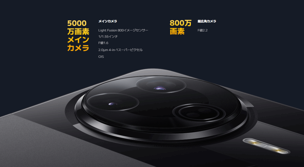 | アウトカメラ(広角) | 5000万画素|F1.6|OIS|1/1.55インチ|Light Fusion 800 |