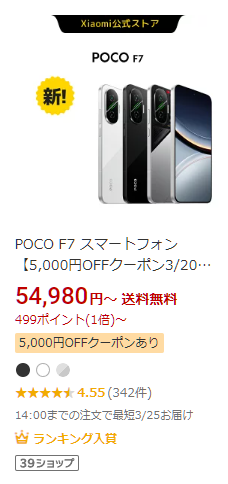 POCO F7はAmazonXiaomi 公式 楽天市場店で定期的にセールが行われています。そのため、そのセールを狙って購入するのがおすすめです。
