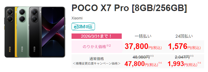 IIJmioでPOCO X7 Proの取り扱いがあり、MNP乗り換えの場合、8GB+256GB版は3万9800円、12GB+512GB版は4万9800円となっています。