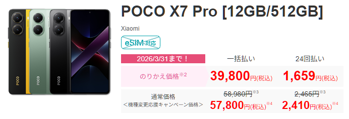 IIJmioでは、2026年3月31日まで端末特価セールが行われており、POCO X7 Proのメモリ12GB・ストレージ512GB版がIIJmioにMNP乗り換え+同時に端末購入で2万9800円となっており、ぶっちぎりの安さです。