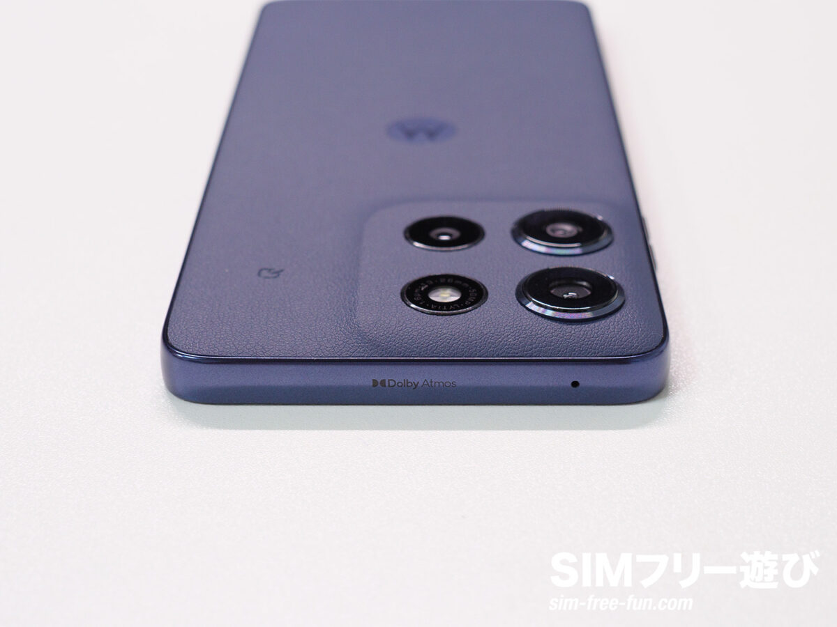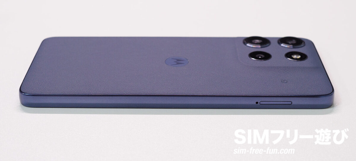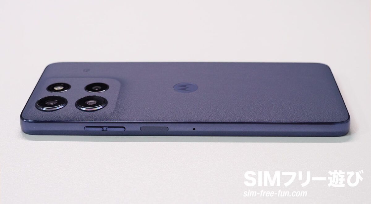 背面はレザー調になっており、格安なミドルレンジの割には質感が高い印象です。ただ、ミドルレンジの機種と比べて高級感がすごくあるという印象ではなく価格帯を考慮するとそこそこ良い感じに仕上がっています。