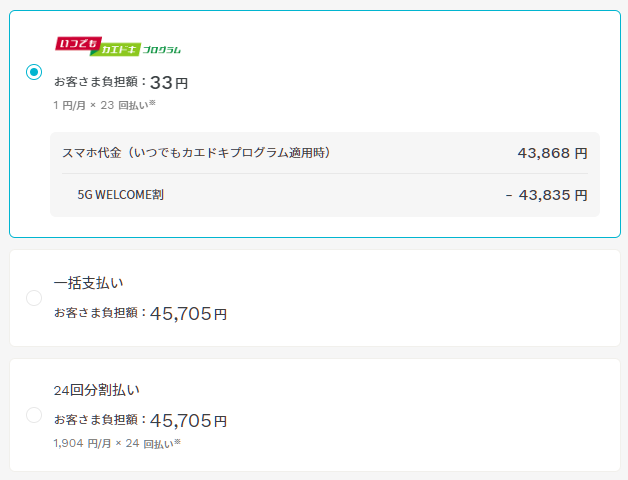 さらに、いつでもカエドキプログラム利用時の残価設定額が4万5672円と発売当初の3万360円から増額されました。23カ月目に端末を返却することで、残価の支払いが不要となり、総支払額が33円となります。