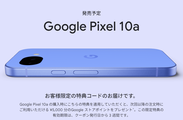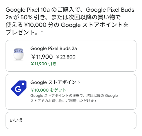 2026年4月7日から4月27日午後11時59分(日本時間)までにGoogle Pixel 10aを購入すると「Google Pixel Buds 2aが50%引き」または「次回以降の買い物にお使いいただける 10,000分のGoogle ストアポイント」のいずれかを選択できるキャンペーンが行われています。