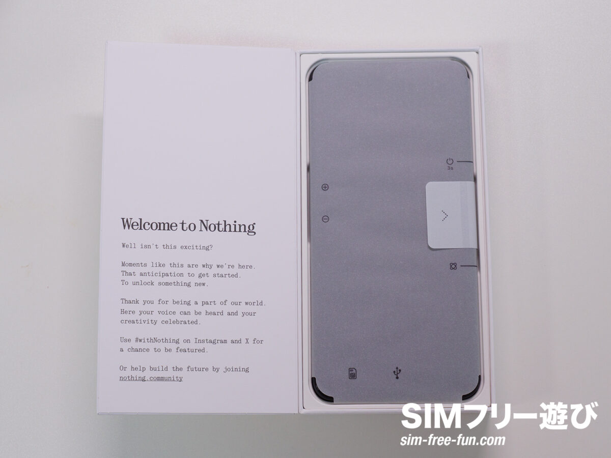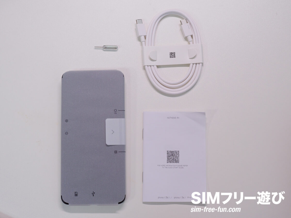 | 本体付属品 | Nothing ケーブル (USB-C / USB-C)100 cm|Phone (3a) スクリーンプロテクター (貼付済み)|SIMトレイ取り出しツール|安全に関する情報 |