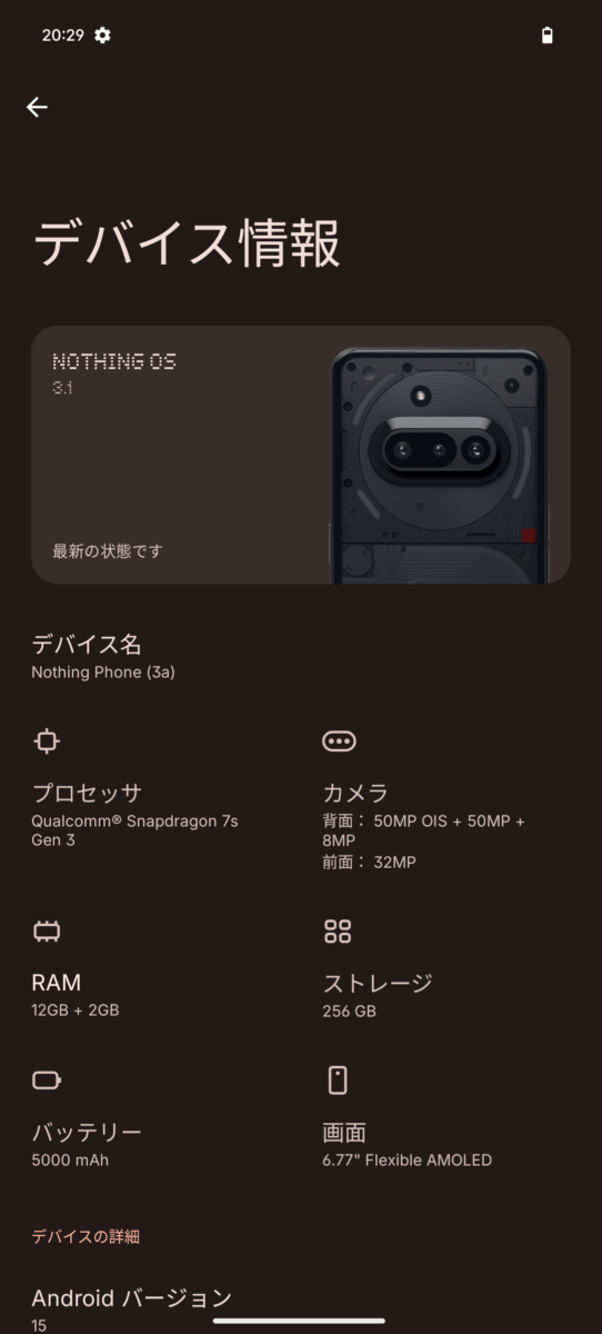 Nothing Phone (3a) のOSは基本的に素のandoridとなっています。素のAndoridですが、デザインには拘っており、インターフェイスなどはかなり凝っています。その反面、設定画面などは素のAndroidとほぼ変わりません。