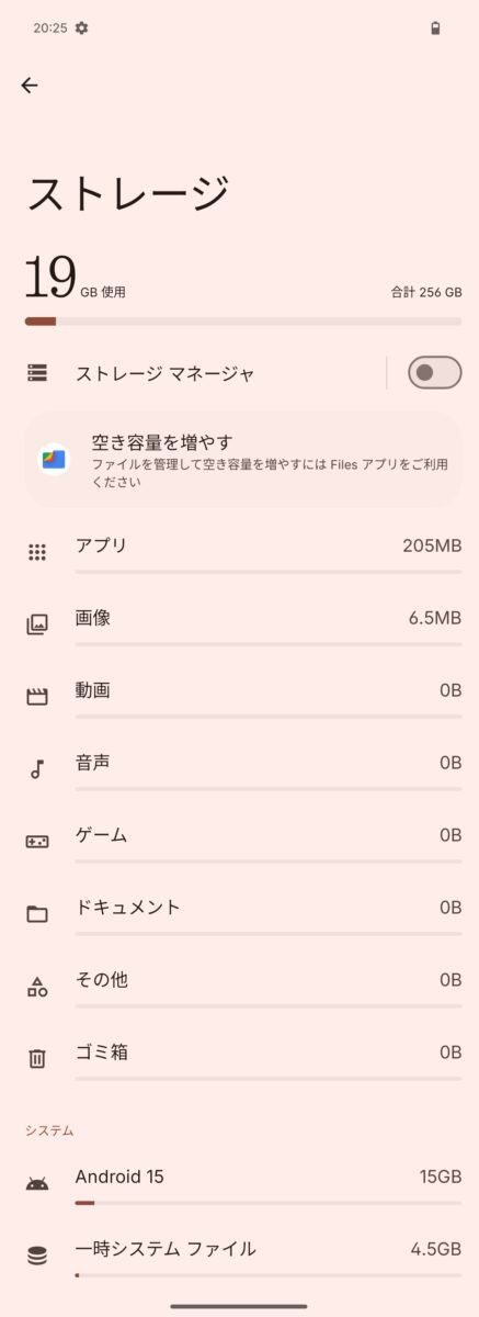 ストレージ使用状況は19GBとなっていました(若干の誤差はあると思います)。かなり使用量が少ない印象です。