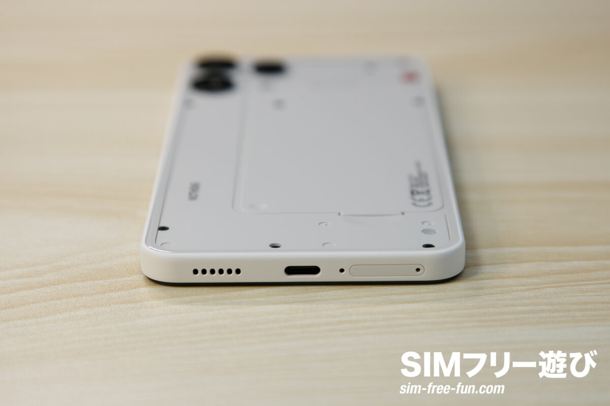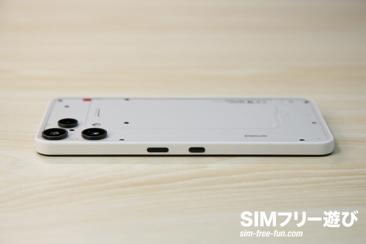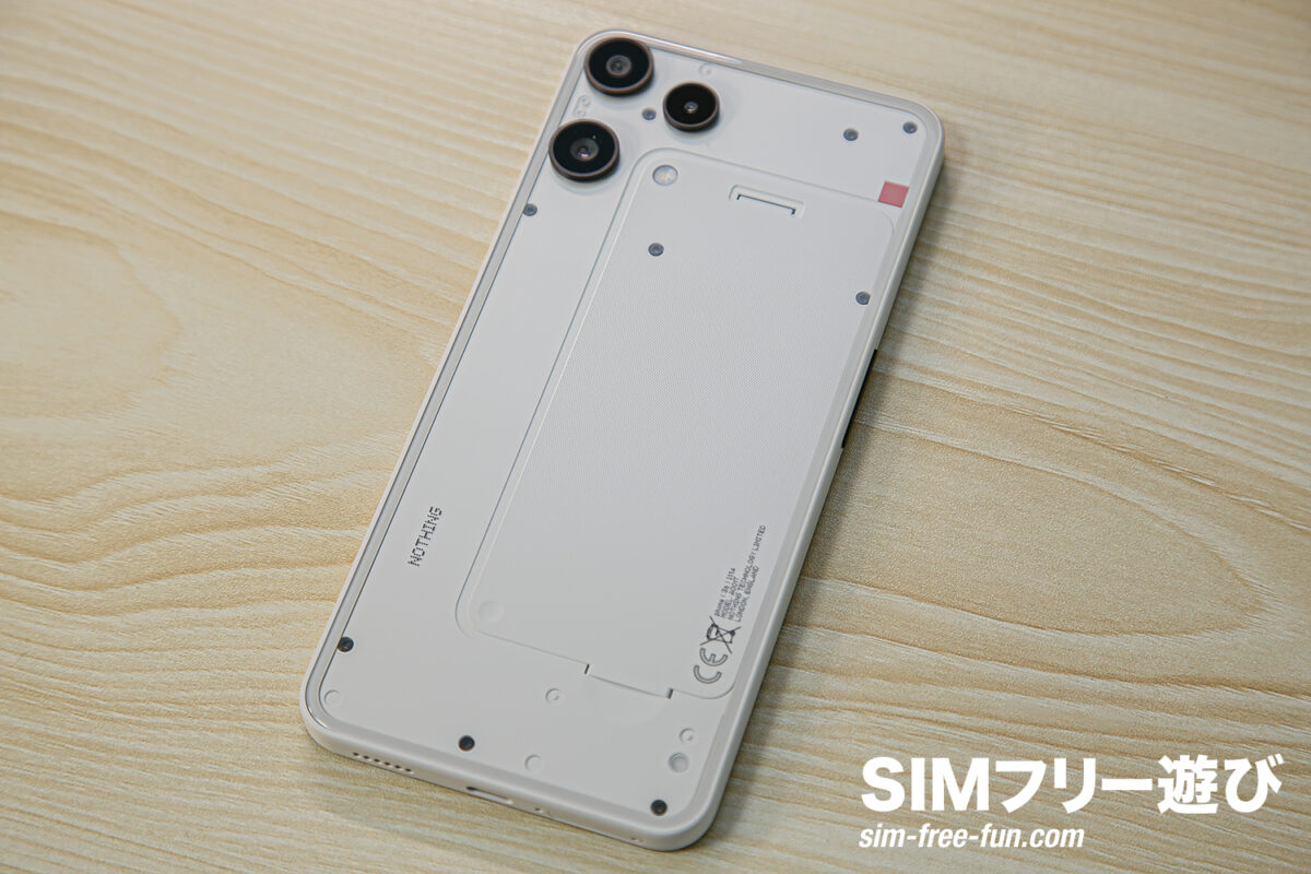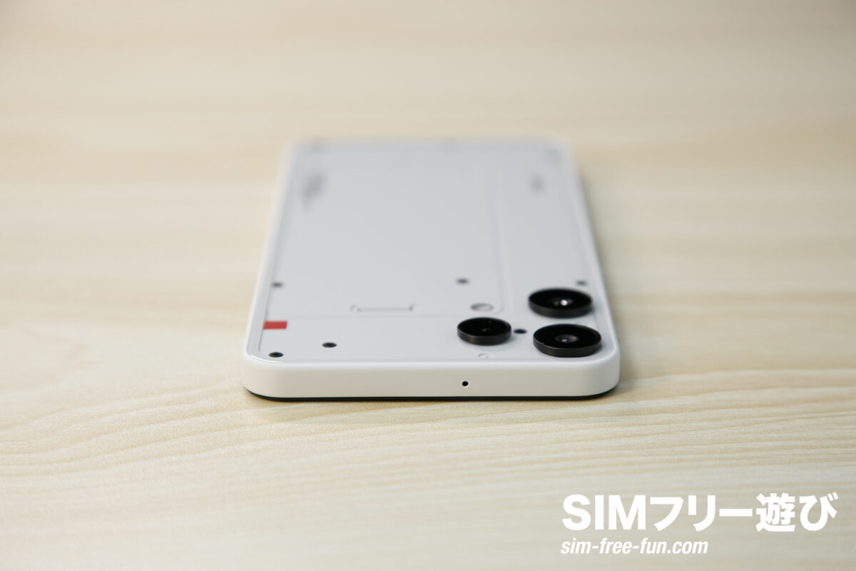 この背面こそがNothingのスマホの象徴でもあります。テック系が好きな方には刺さりそうなデザインですね。ただ、万人受けする印象ではないデザインであることは確かです。