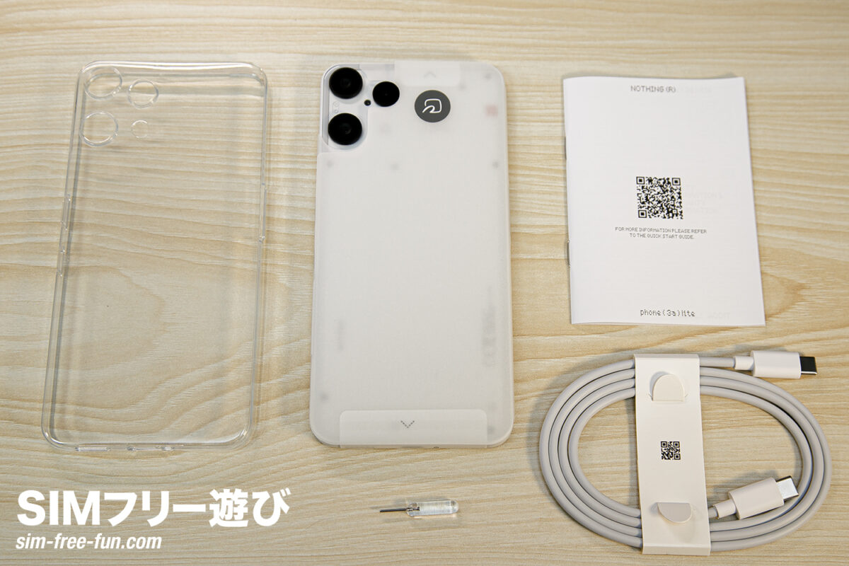 | 本体付属品 | Nothing Cable (c-c) 100 cm|Phone (3a) Lite ケース|Phone (3a) Lite スクリーンプロテクター (貼付済み)|SIMトレイ取り出しツール|安全と保証に関する情報 |