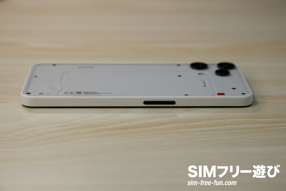 ファーストインプレッションとしては、外観がもっと安っぽいのかな…と思っていましたが、Phone (3a) と全く変わらない印象で外装の仕上げも非常によく感じます。側面は樹脂製ですが全体の質感の良さからか、側面は安っぽさよりもデザインの特性に相まった仕上がりと言ったところ。