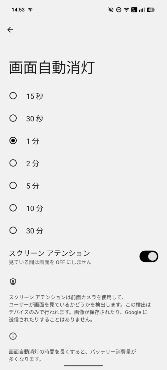 画面自動消灯の項目では、消灯するまでの時間が選べる他に「スクリーンアテンション」という項目があります。画面を見ている間は消灯しないようにする機能です。