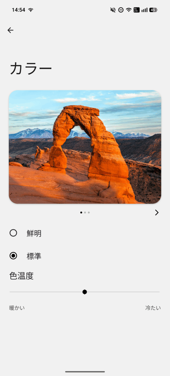 カラーの項目でディスプレイの色味を変更できます。設定項目は「鮮明」「標準」の2択です。ただ、色温度設定がスライドバーでできるようになっているので自分好みの色にはしやすいと思います。もう少し設定項目があると良いとは思いますが…