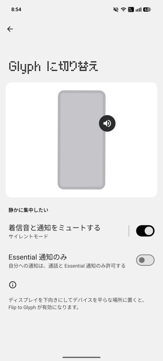 この設定をすると、マナーモードやサイレントモードではない通常の音が出る状態でも、一切音が出ないようになる変わりに、Glyphライトの点滅だけによってお知らせしてくれます。