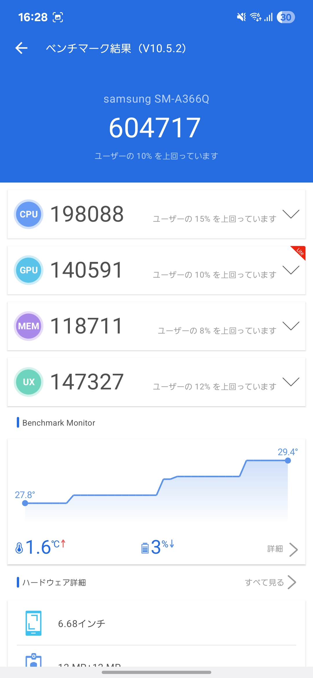 ミドルレンジの端末としてはSoC性能値をそのまま反映したようなスコアで、至って良くも悪くもないという印象で、ミドルレンジど真ん中という印象でしょうか。