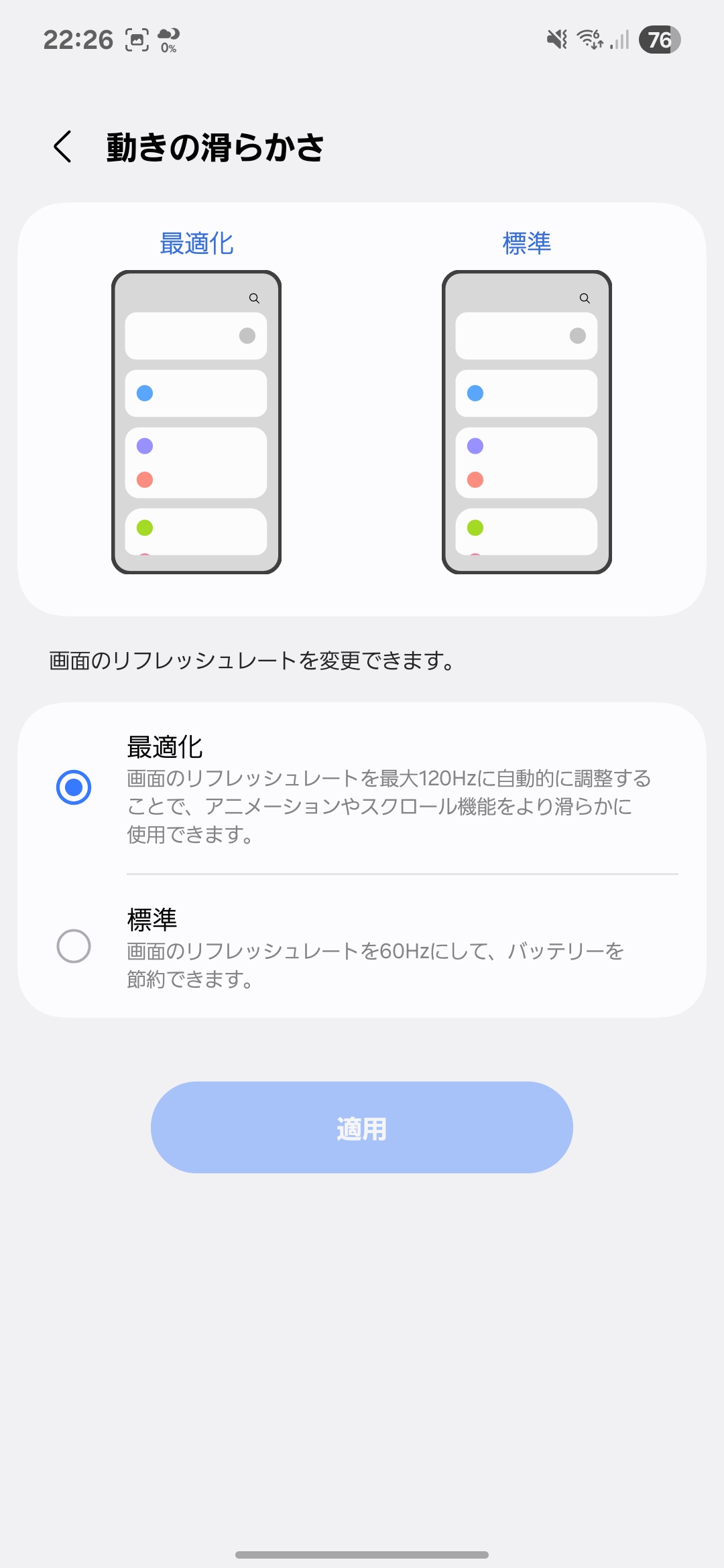 Galaxy A36 5Gのリフレッシュレートは最大120Hzとなっています。筆者が確認したところ、60Hz、120Hzでの動作を確認しました。
