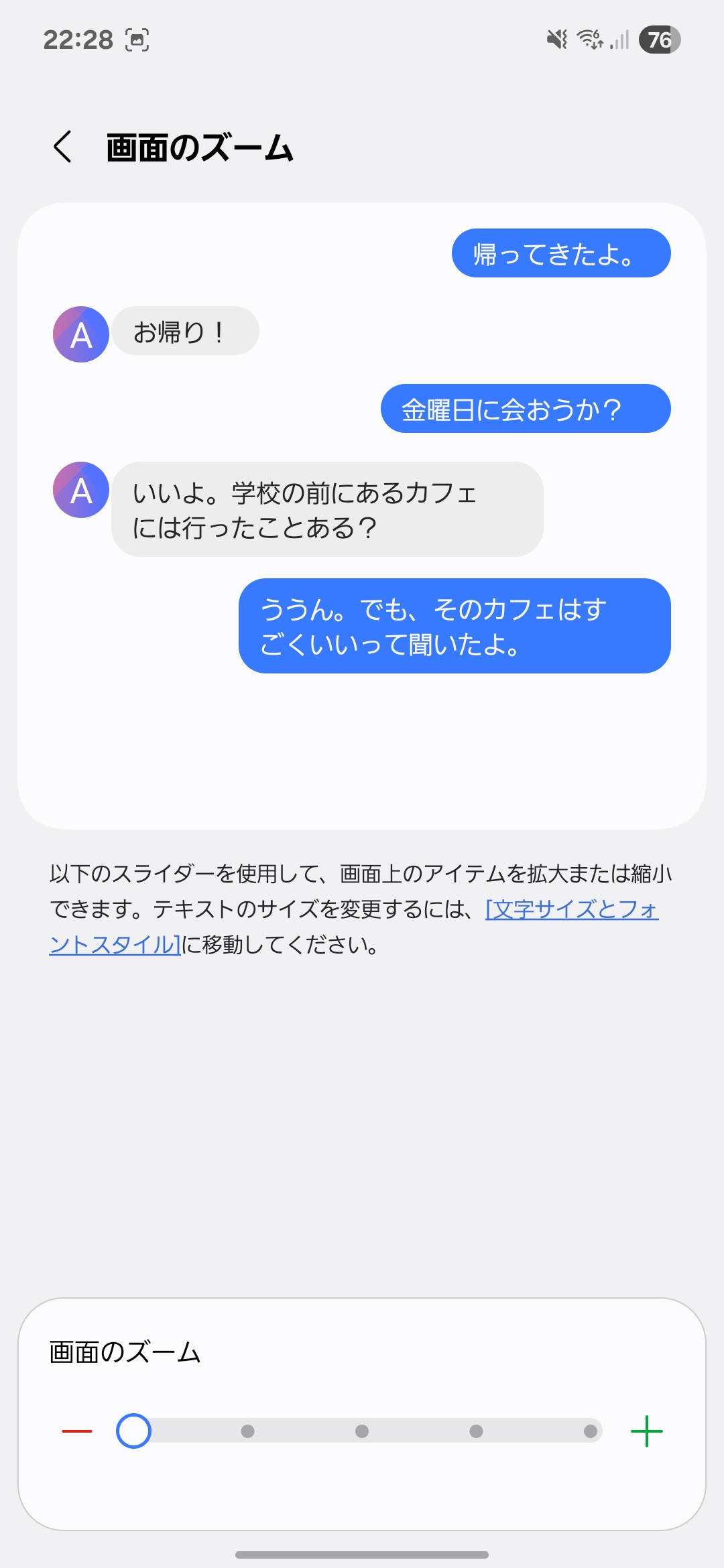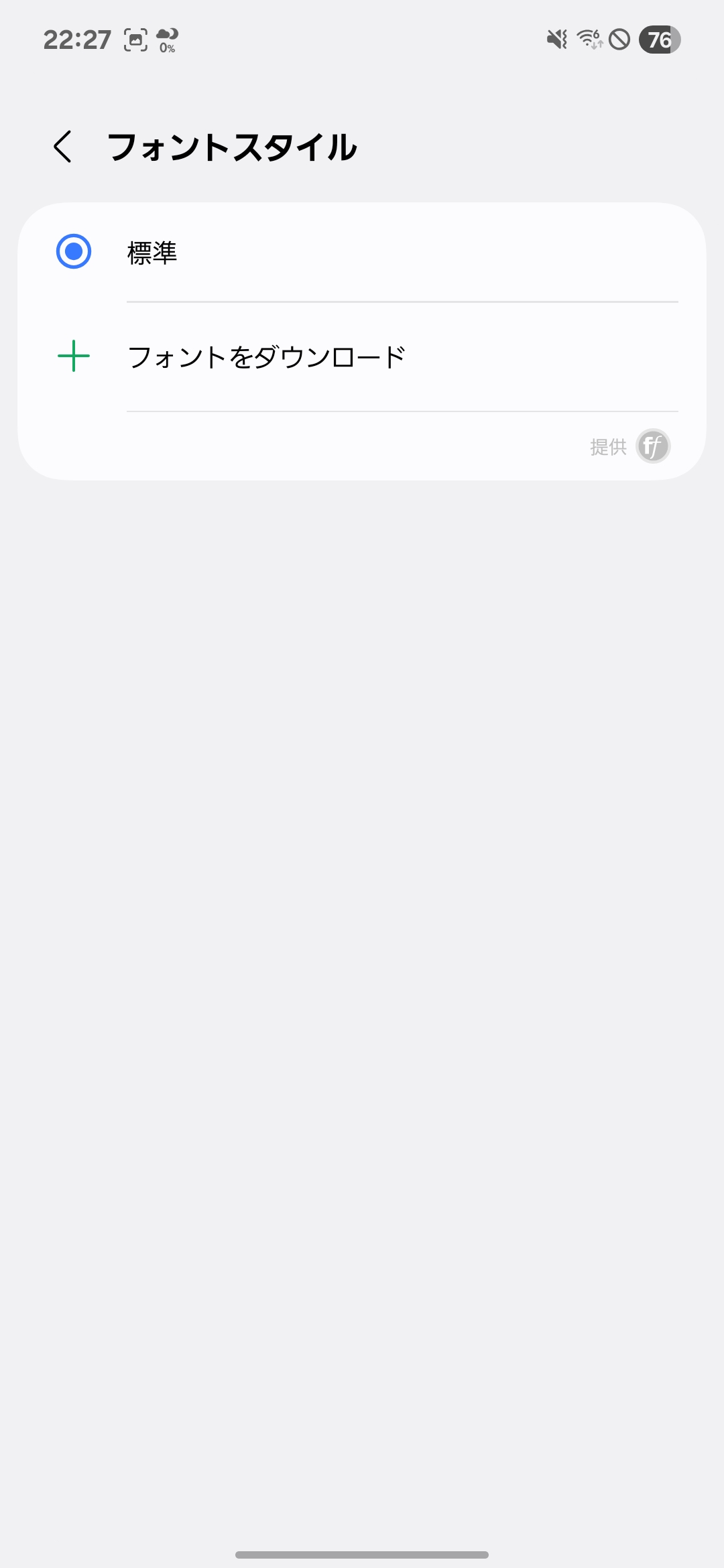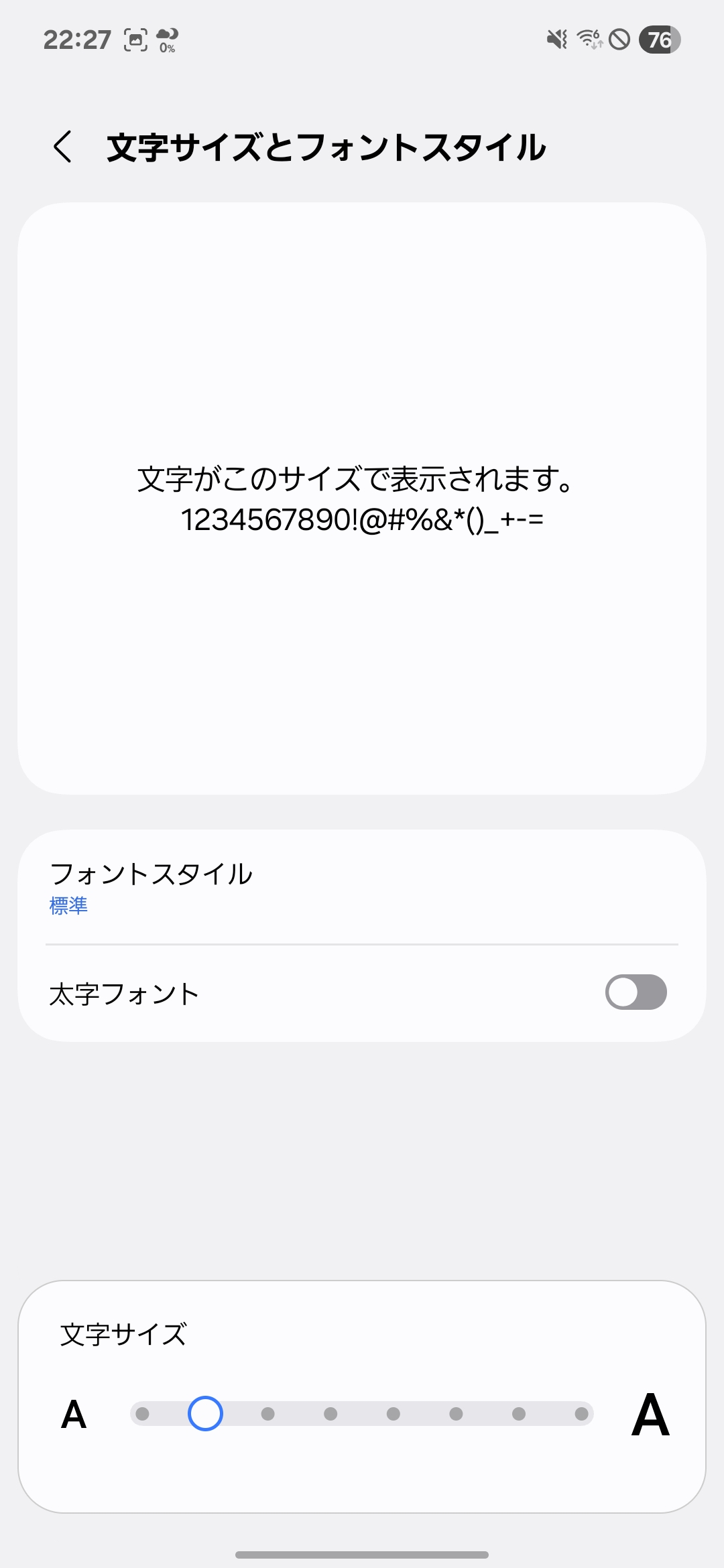 Galaxy A36 5Gの文字サイズは8段階でサイズを変更可能です。また、フォントも買える事ができ、標準フォント以外はダウンロードする形で提供されます。無料のものだけでなく、有料のフォントも多く揃っています。