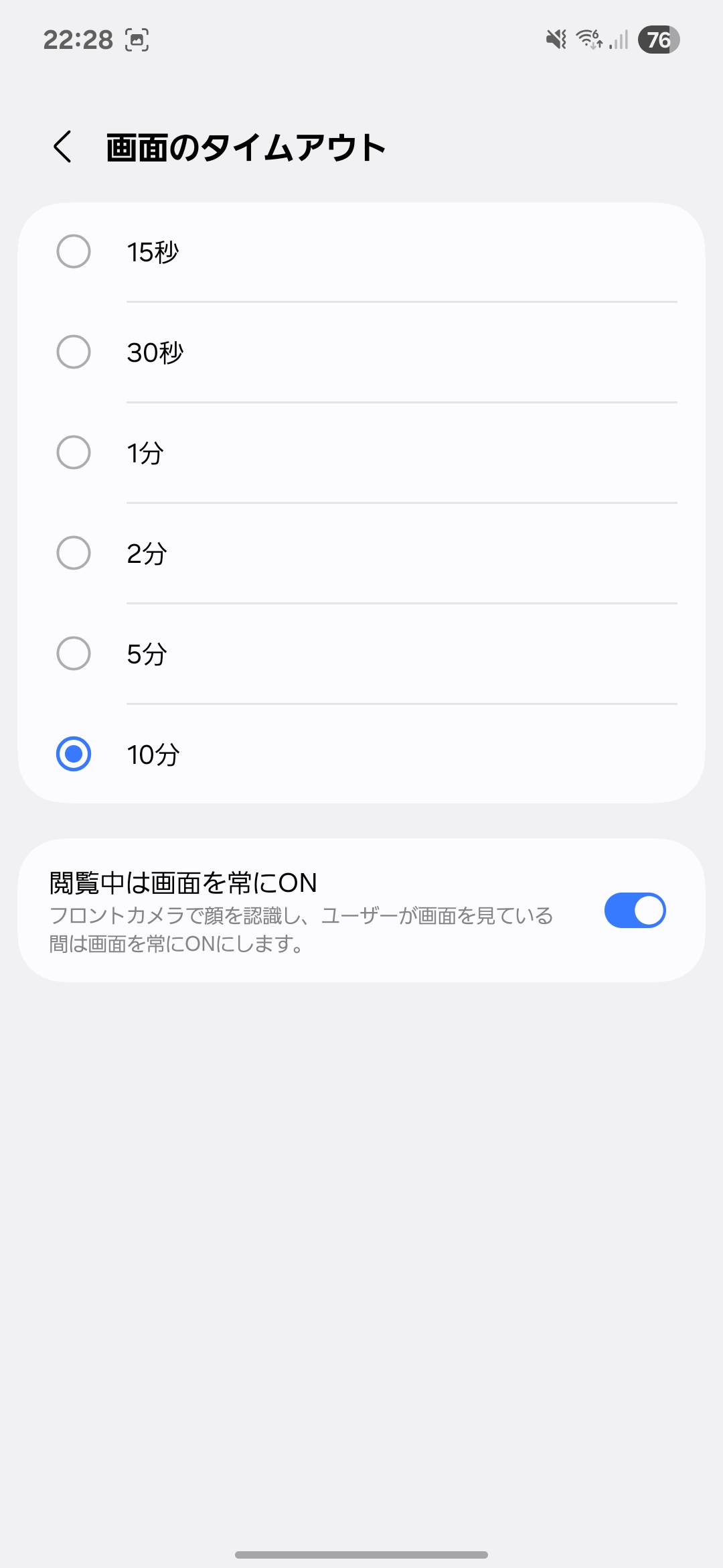 画面のタイムアウト設定画面に「閲覧中は画面を常にON」という設定項目があり、こちらをONにすれば、記述通り閲覧中は画面が消えないようにすることができます。