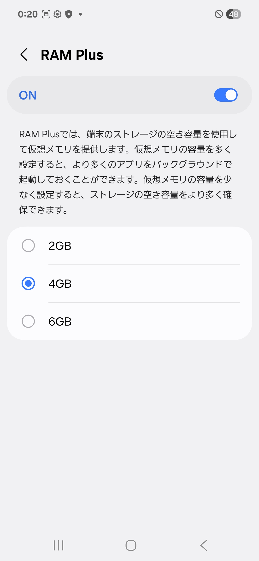 2025年に発売された機種ではどの機種でもメモリ拡張が可能になっています。Galaxy A36 5GでもRAM Plusという項目でメモリ拡張が可能です。