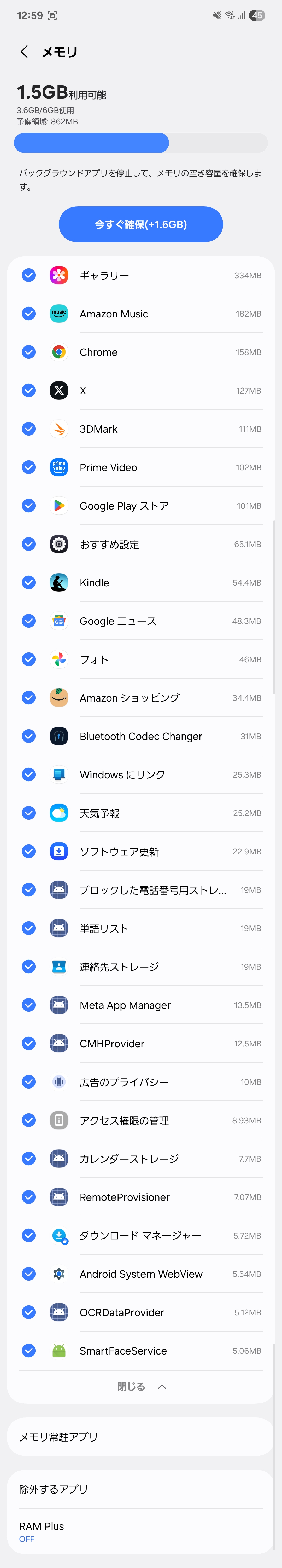 では、筆者が利用している状態でのメモリ使用量を確認してみましょう(メモリ使用量は筆者の使い方によって利用しているメモリ量です。人によってスマホの使い方は異なるため、メモリ使用量も異なることをご理解ください)。