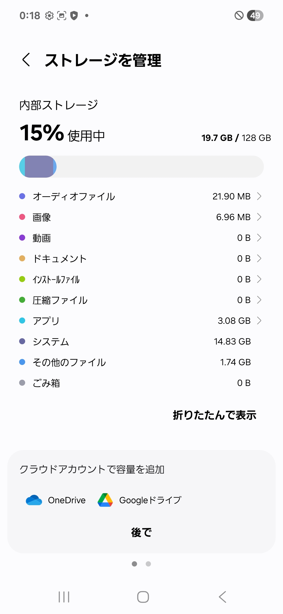 初期時のストレージ使用量は約19.7GBとなっていました(スクリーンショットを撮っているため、多少のズレはあります)。