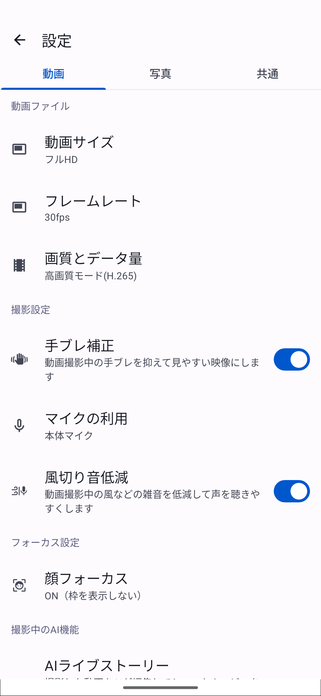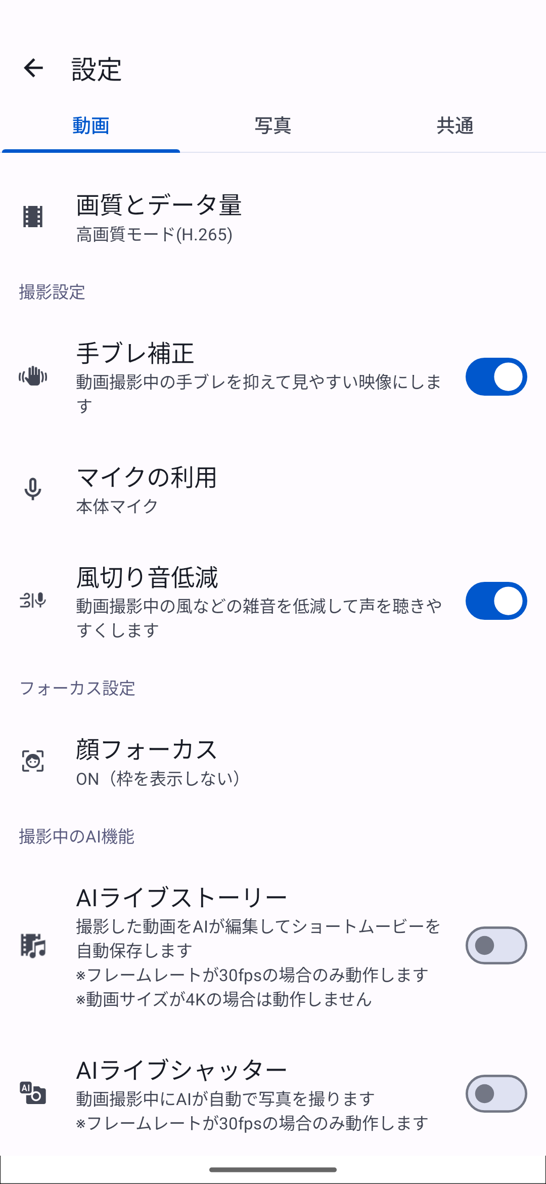 カメラアプリの各共通設定はそこそこ充実していて使いやすい機能が多く揃っている印象です。