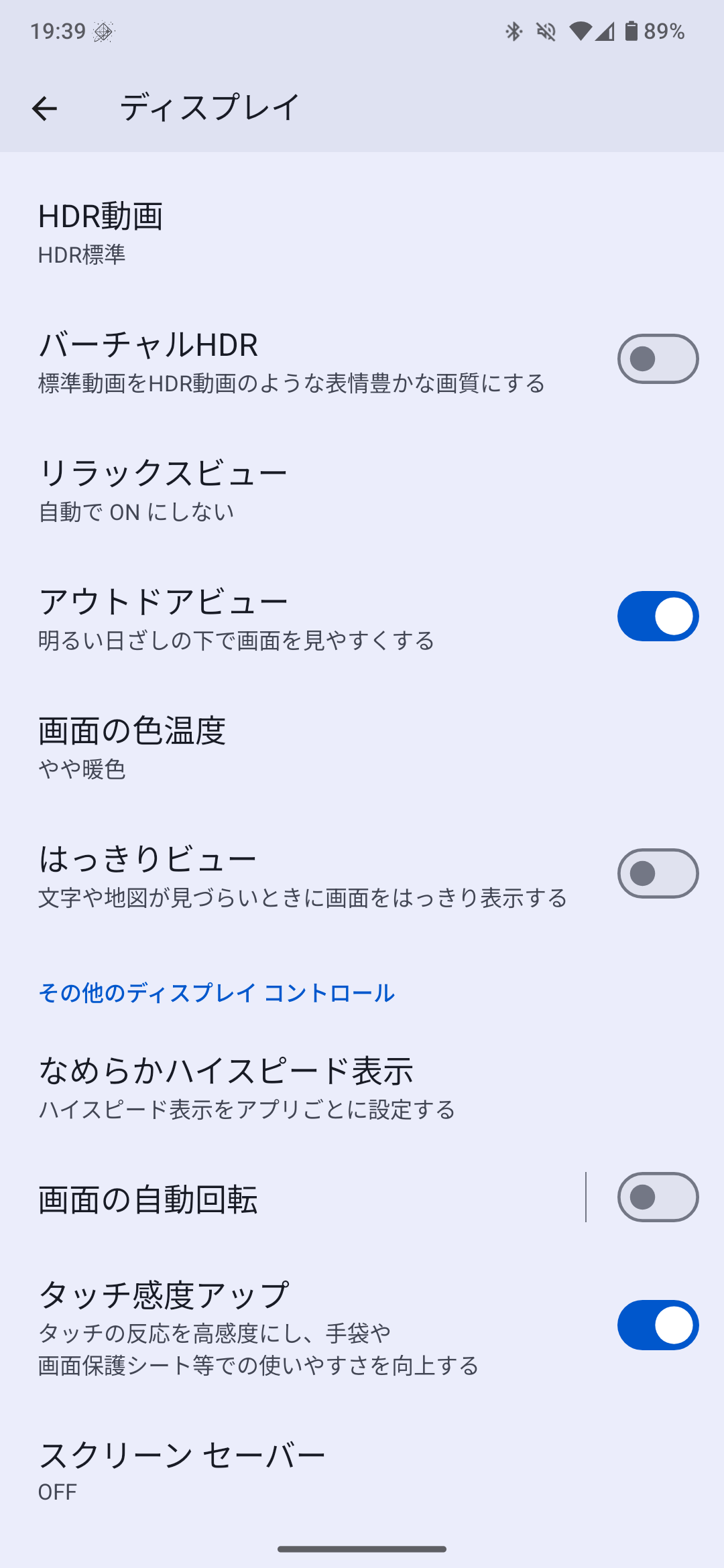 【設定】→【ディスプレイ】の設定項目は下記の通り。