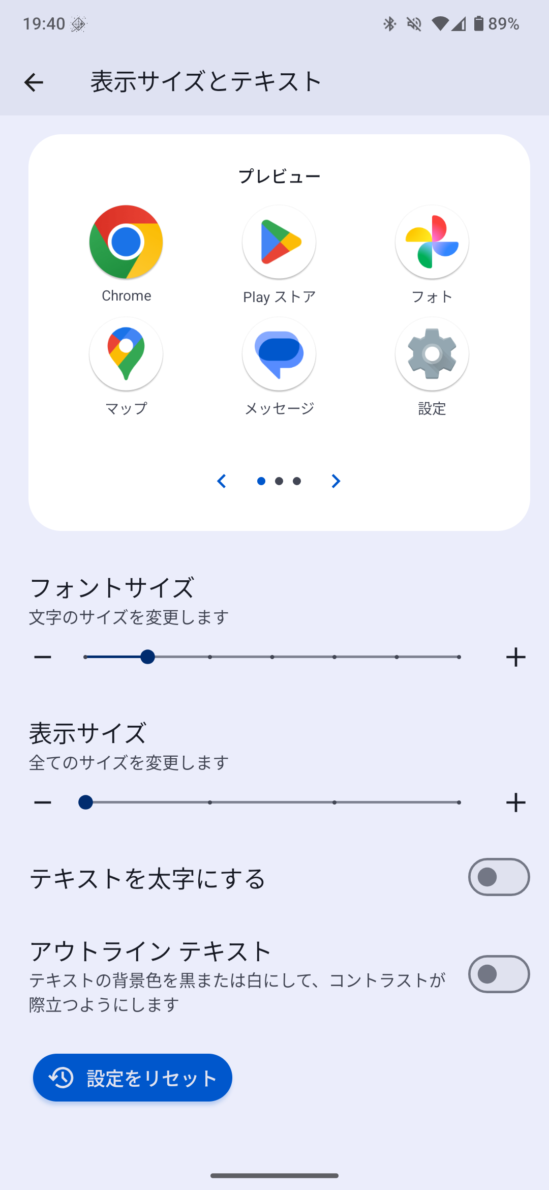 AQUOS sense 10の表示サイズとテキストは、Pixelシリーズと同じ設定画面ですね。フォントは7段階、表示サイズは4段階で変更可能です。