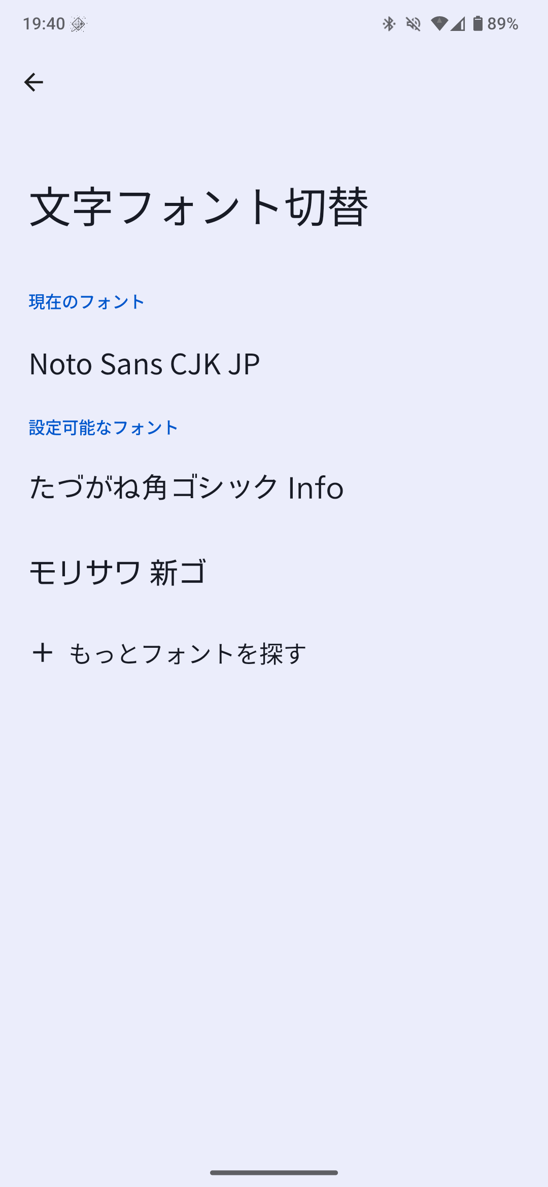 個人的にあまり隙じゃないので、Andoroidのために作られた標準フォントである「Noto Sans CJK JP」に変更しています。このフォントは標準でインストールされています。また、モリサワ 新コ゚も標準でインストールされていました。