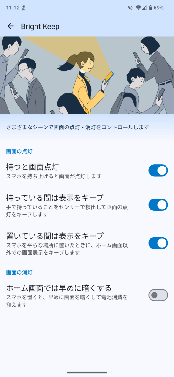 「持つと画面点灯」「持っている間は表示をキープ」「ホーム画面では早めに暗くする」の項目があります。持っている間は表示をキープなどは他メーカーでも同じような機能がありますが、置いている間は表示をキープなど、便利な機能が揃っていますね。